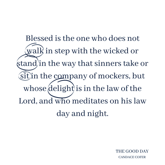 Blessed is the one who does not walk in step with the wicked or stand in the way that sinners take or sit in the company of mockers, but whose delight is in the law of the Lord, and who meditates on his law day and night. That person is like a tree planted by streams of water, which yields its fruit in season and whose leaf does not wither— whatever they do prospers. Not so the wicked! They are like chaff that the wind blows away. Therefore the wicked will not stand in the judgment, nor sinners in the assembly of the righteous. For the Lord watches over the way of the righteous, but the way of the wicked leads to destruction. - Psalm 1