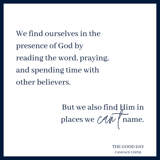 We find ourselves in the presence of God by reading the word, praying, and spending time with other believers. But we also find Him in places we can’t name. In the space where compassion and kindness are shared between people. In the way time stops for a breath when we smell the summer jasmine in the air. In the melody we hear when the written word seeps into our spirit.